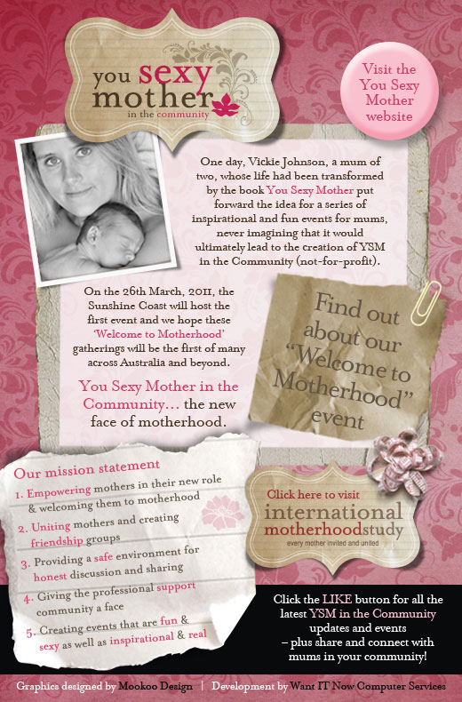 First of all I would like to share some work I have been doing for You Sexy Mother in the Community, a not-for-profit organisation which aims to provide a community for new mums in particular, through events inspired by the You Sexy Mother books by Jodie Hedley-Ward. The first event will be on the Sunshine Coast on Saturday 26th March 2011. Anyway, I was asked to design some graphics for their Facebook page which should be uploaded any day soon, but here’s a sneak peek at what it will look like… all very exciting!
